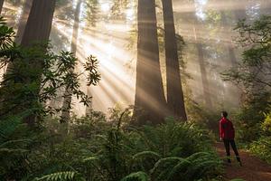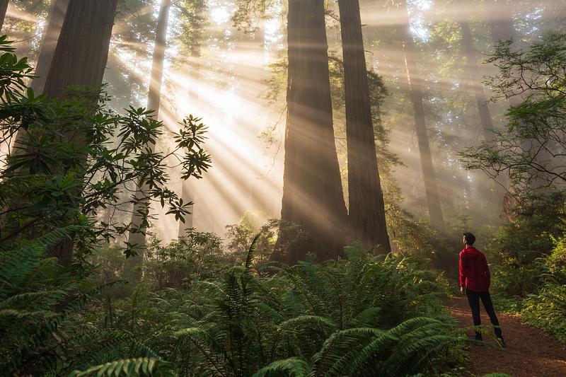 An incredible moment among the ancient coastal Redwoods of Northern California as sunlight breaks through the fog. Redwoods National and State Parks. Redwoods National and State Parks.