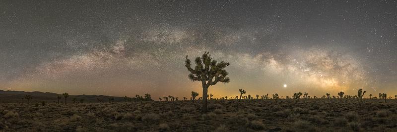 At the end of February, the core of the Milky Way is just beginning to become visible over the horizon in the northern hemisphere again. During a very short window of only a few minutes between moonset and the beginning of sunrise, I was able to capture this panorama of the Milky Way arching over a picturesque Joshua Tree in the Mojave Desert.