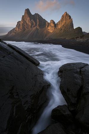 The icy North Atlantic ebbs and flows along a volcanic blank sand beach at the foot of Iceland’s Eystrahorn mountains.