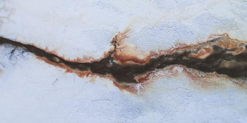 Deep red and black mineral deposits form unique shapes and patterns on top of the dry salty surface around this lake in the Owens Valley of California.